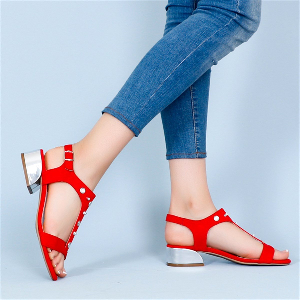 Kırmızı süet Alçak Topuk Kadın Sandalet 3003Y